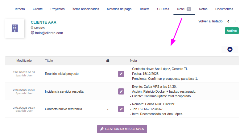 - Verás la pestaña "Note+" en estos elementos de Dolibarr: Productos, servicios, clientes, proveedores, contactos, miembros, usuarios, proyectos, contratos, cotizaciones, pedidos de cliente, pedidos a proveedor, facturas a clientes, facturas de proveedor, eventos de calendario, "Bill of Materials" (listas de materiales, órdenes de manufactura, workstations, tickets.