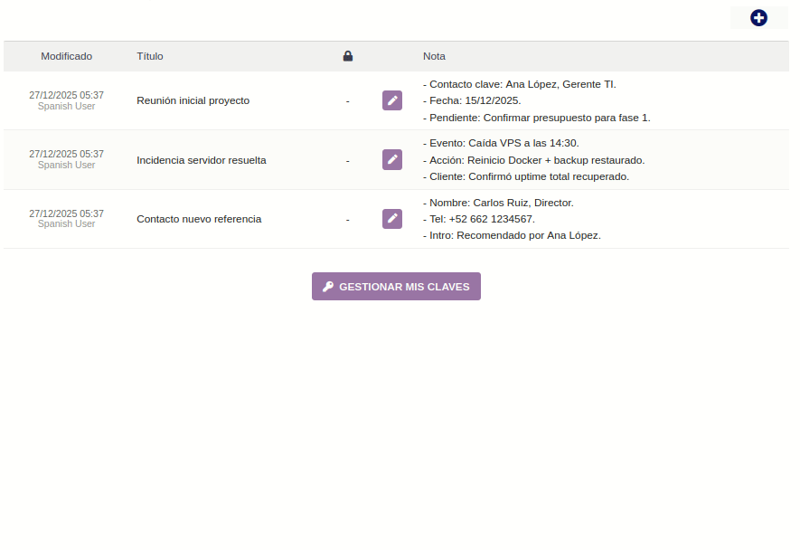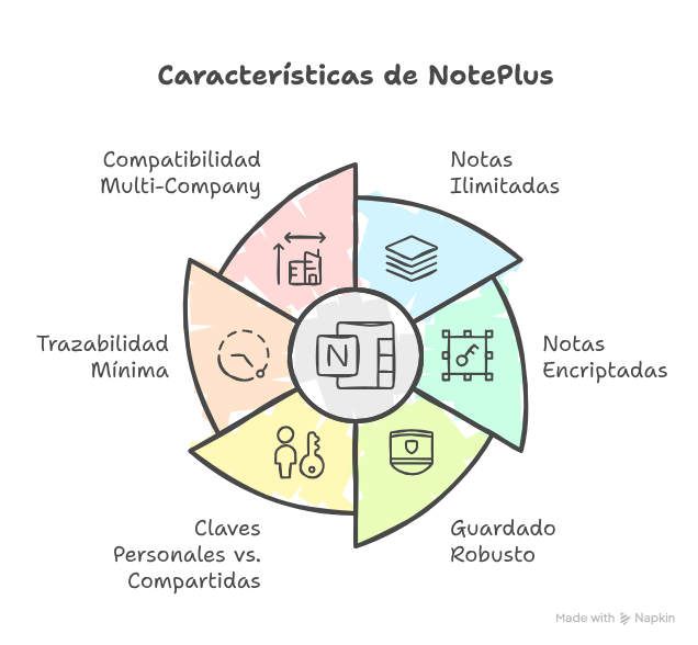 Este módulo amplía la función nativa de notas en Dolibarr permitiendo agregar notas ilimitadas y altamente seguras a casi cualquier elemento del ERP, con cifrado AES de 256 bits y claves personales o compartidas, gestión de contraseñas mediante PBKDF2 y compatibilidad multi-company.