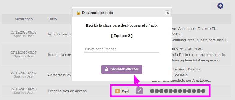 - Cuando un usuario marca una clave creada por él como COMPARTIDA entonces otros usuarios pueden usarla para crear notas encriptadas, usando siempre la misma clave de desbloqueo. De este modo se puede tener información encriptada por diferentes equipos de la empresa.