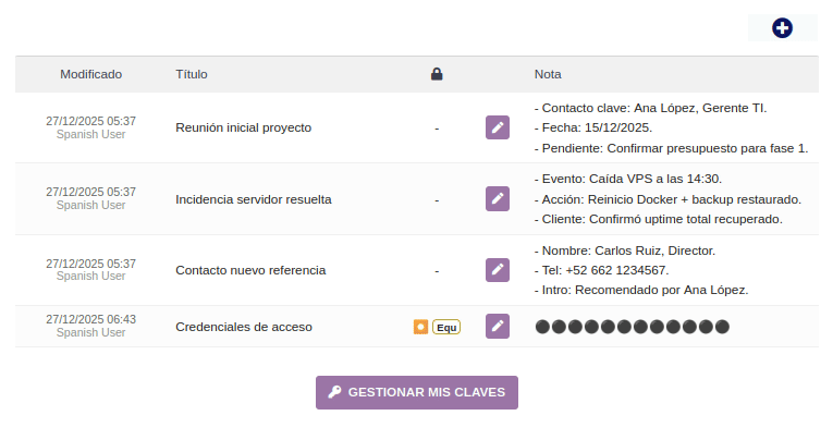 las notas que se agregan a un elemento de una compañía quedan visibles únicamente para esa compañía. Y las claves que un usuario crea en una compañía también solamente son accesibles cuando opera en esa compañía.