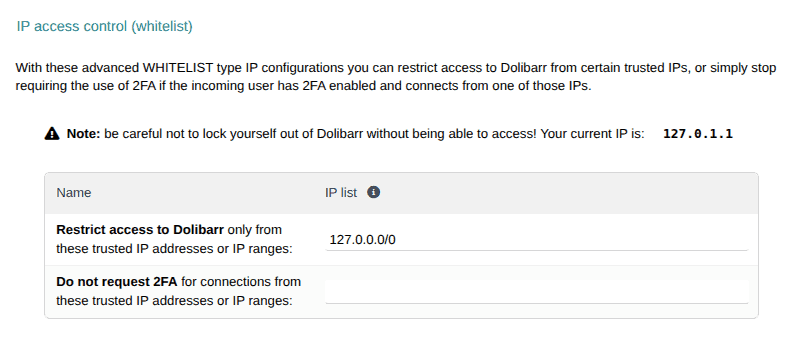 The module displays your current IP address at the top of the settings . This is the IP address your server detects when you connect to Dolibarr—and it's exactly what you should enter in the whitelist.