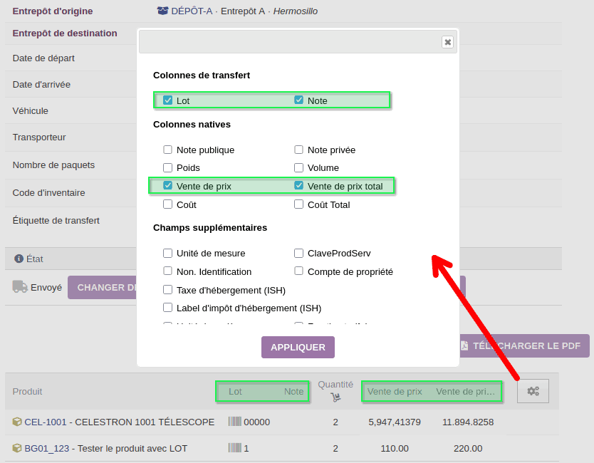 Chaque entreprise organise ses produits de manière légèrement différente. Pour cette raison, vous pouvez choisir les colonnes à afficher dans le tableau des produits d'un transfert :