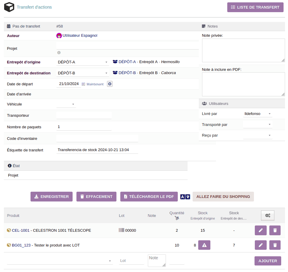 Le module permet le téléchargement d'un fichier PDF avec la liste des produits à transférer et un espace en bas pour les trois signatures de l'expéditeur, du transporteur et de la personne qui recevra les produits dans l'entrepôt de destination, comme c'est habituel dans ce type de mouvement de marchandises.