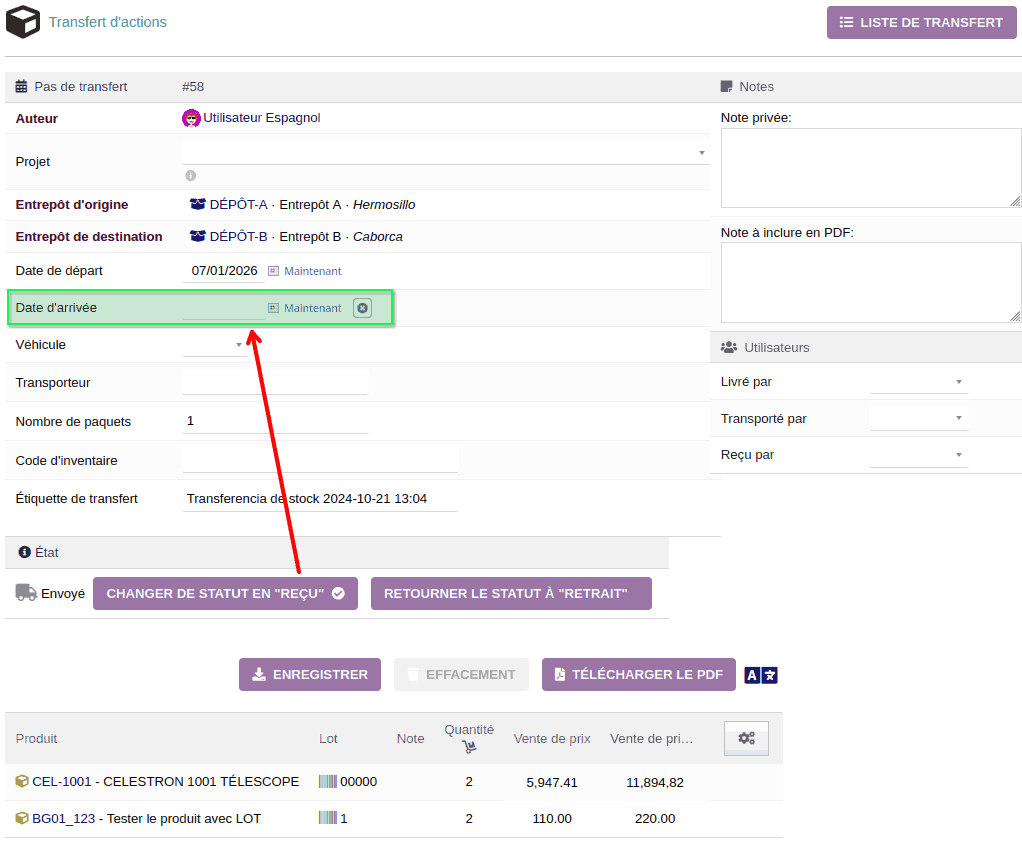 Une fois que nous avons le stock nécessaire de tous les produits à transférer, le bouton "Changer l'état en Envoyé" deviendra visible. Il suffit de le presser pour changer l'état de notre transfert. Le système nous obligera à remplir la "Date de départ". Une fois que l'état est passé à "Envoyé", le bouton "Changer l'état en Reçu" apparaîtra, nous obligeant également à remplir la "Date d'arrivée".